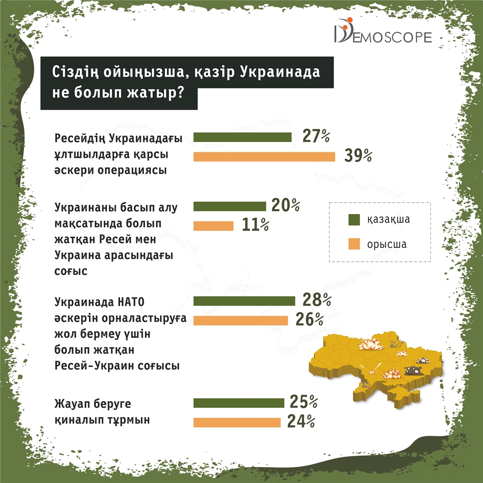 DEMOSCOPE зерттеуі көрсеткендей, Украинадағы жағдай туралы әртүрлі қарама-қарсы пікірлердің болуы Қазақстандағы азаматтардың қай тілде сөйлейтініне ғана байланысты емес.