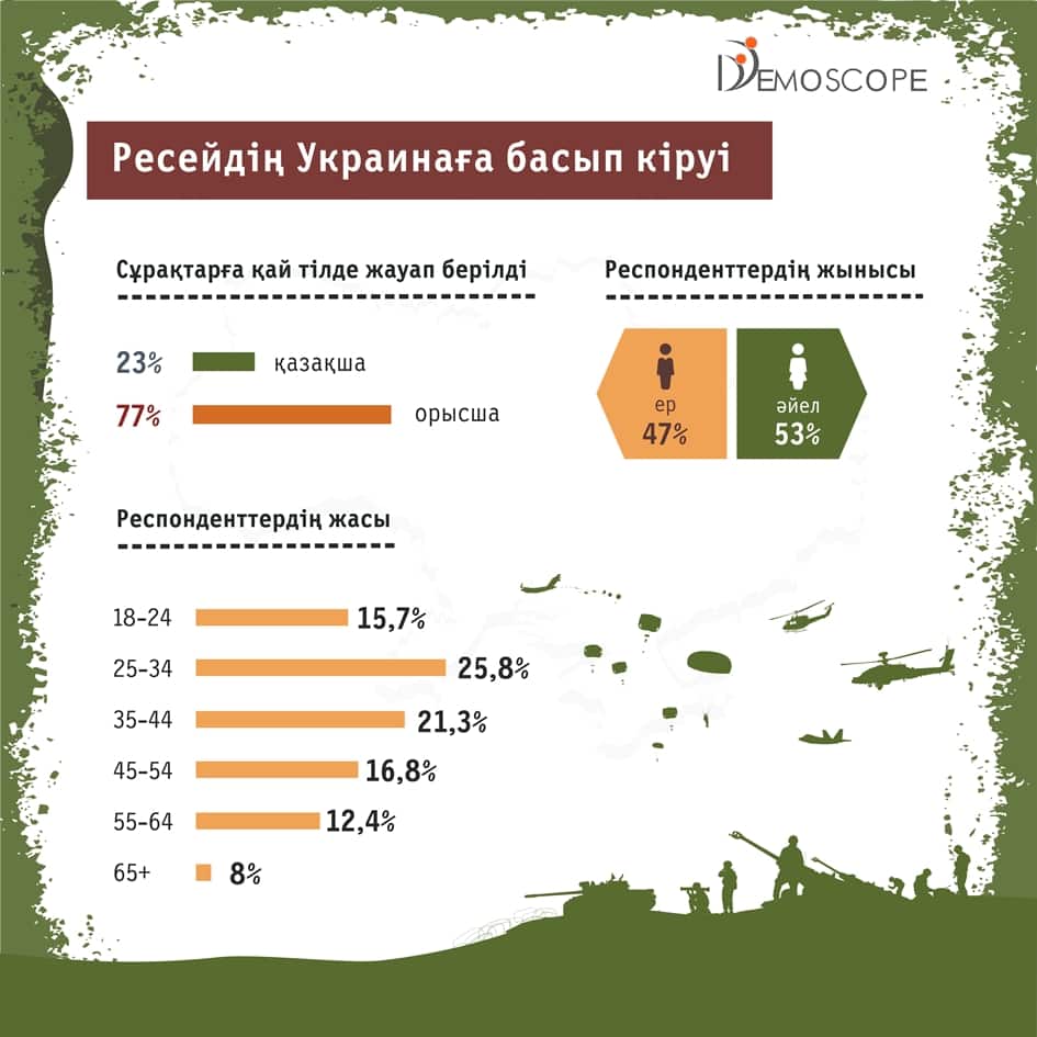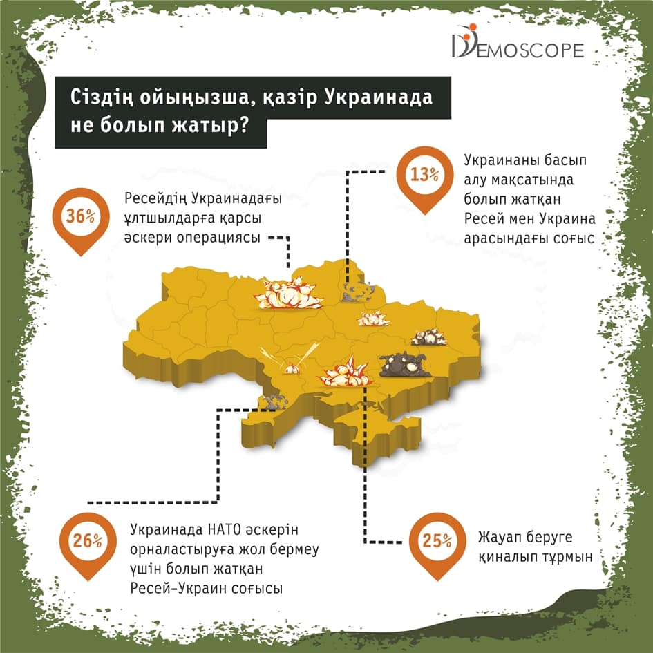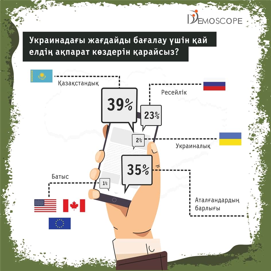Қазақстандықтарды да айналып өтпеген бүгінгі ақпараттық соғыс жағдайында халықтың Украинадағы жағдай туралы ой түйіп, бағамдауына ақпарат көздерінің ықпалы орасан зор. Demoscope Бюросы жүргізген сауалнама деректеріне сәйкес, азаматтардың 39%-і Қазақстандағы медианы қарайды. Сонымен қатар, респонденттердің төрттен бір бөлігі (23%) Ресей жаңалықтарын қалт жібермейді. Небәрі 2% респондент украиналық және 1% Батыс елдерінің медиасына сенеді екен. Сауалнамаға қатысқандардың үштен бірі (35%) жаңалықтарды әртүрлі ақпарат көздерінен алады екен.