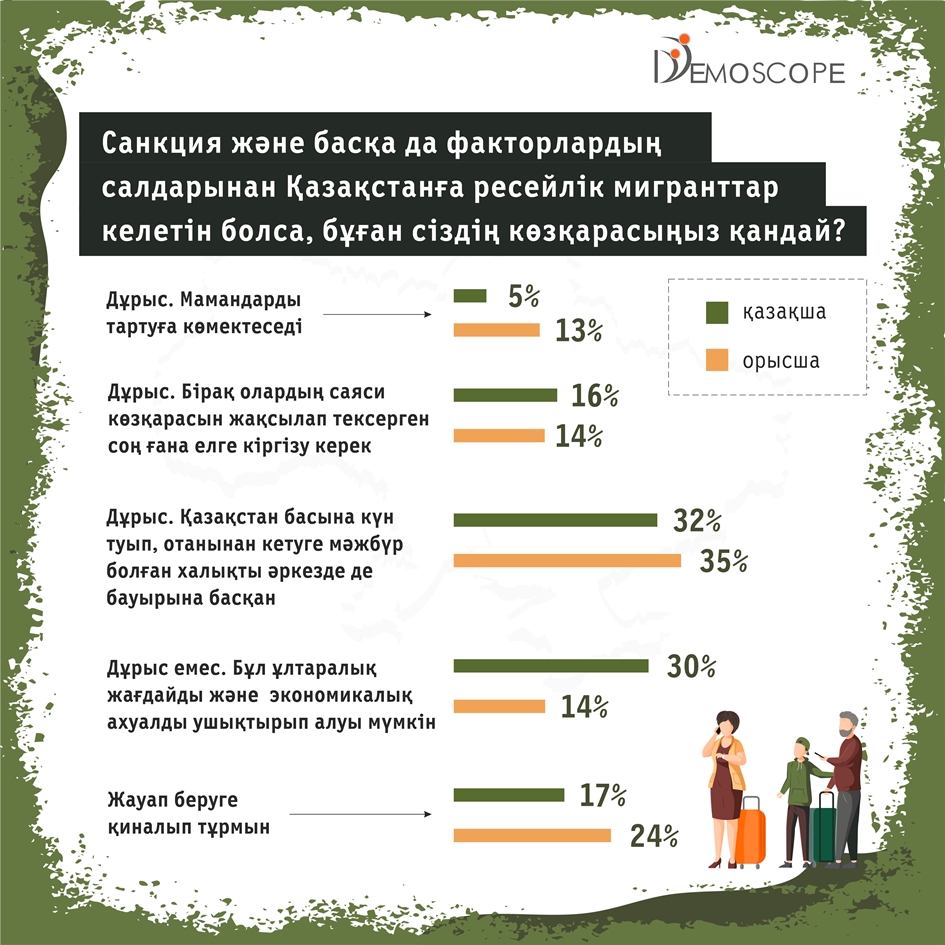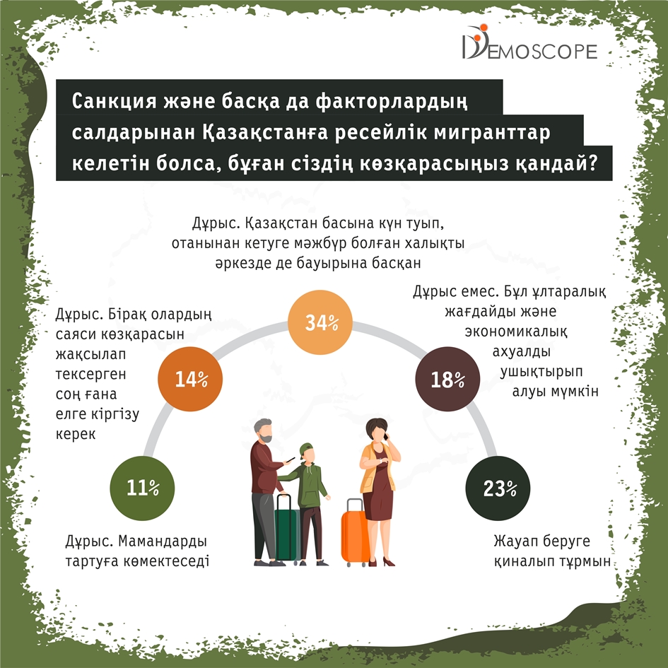 Зерттеу барысында санкция және басқа да факторлардың салдарынан Қазақстанға ресейлік мигранттар қоныс аударатын болса, халықтың қалай қарсы алатынын білмекші болдық. Жалпы алғанда, респонденттердің көпшілігі (59%) ресейліктердің қоныс аударуын құптайды. Басына күн туып, отанынан кетуге мәжбүр болған халықты қазақ халқы әркезде де бауырына басқанын айтып, ата-бабамыздың қонақжайлығын жалғастырған дұрыс деген қатысушылар — 34%. 14% олардың саяси көзқарасын жақсылап тексерген соң ғана елге кіргізу керек дейді. 11% Қазақстанға жаңа мамандарды тартуға мүмкіндік туады деген ой айтты.
