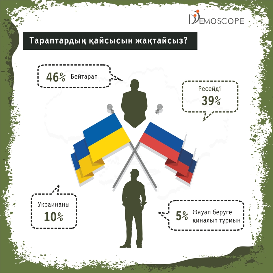 Респонденттердің 39%-і бұл соғыста Ресейді жақтайды. Олардың жартысына жуығы (46%) бейтарап қалуды жөн көреді. Еркектер мен әйелдердің жауаптарын салыстырсақ, еркектер Ресейге қарағанда (46%) Украинаны (58%) жақтайтыны байқалады.