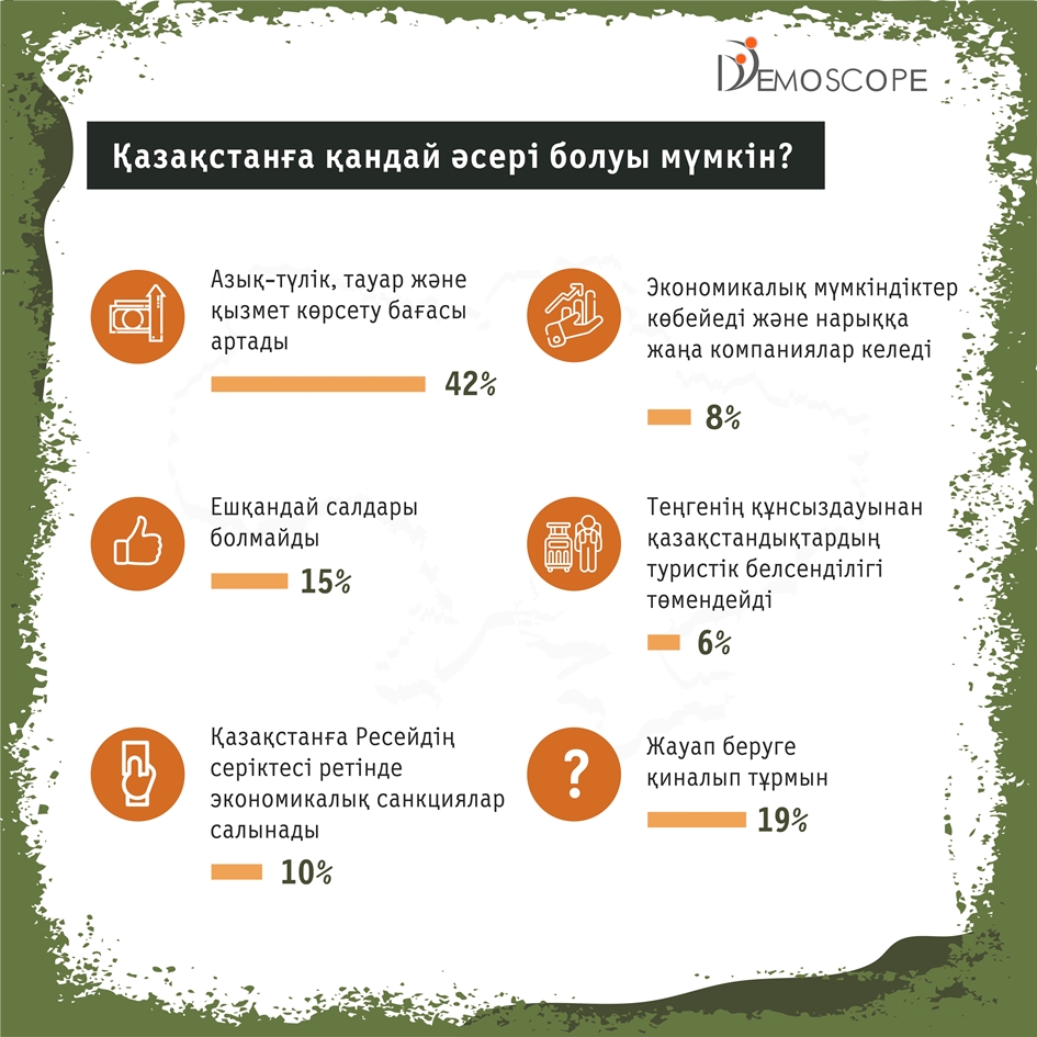 “Украинадағы соғыстың Қазақстан үшін қандай экономикалық салдары болуы мүмкін?” деген сұрақ қойылды. Сауалнама қатысушыларының көпшілігі инфляцияны (42%) таңдады. 15% ешқандай салдары болмайтынына сенімді. 10% Қазақстанға Ресейдің серіктесі ретінде экономикалық санкциялар салынуы мүмкін екенін айтты.