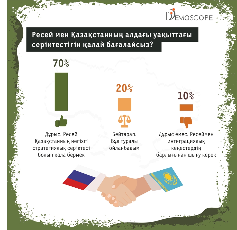 Ресей мен Қазақстанның алдағы уақыттағы серіктестігі туралы халық не ойлайтынын білу де маңызды. Респонденттердің 70%-і санкцияларға да, қақтығыстың өзіне де қарамастан, Ресей Қазақстанның негізгі стратегиялық серіктесі болып қала беретініне және бұл шешімнің дұрыс екеніне сенімді. 10% ғана солтүстіктегі көршімен серіктестіктің соңы жақсы болмайтынын ескеріп, Ресеймен интеграциялық кеңестердің барлығынан шығу керек деп кесіп айтты.