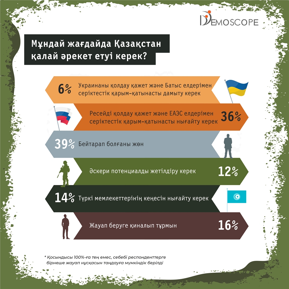 Қатысушыларға “Мұндай жағдайда Қазақстан қалай әрекет етуі керек?” деген сауал қойылды. “Украинаны қолдау қажет және Батыс елдерімен серіктестік қарым-қатынасты дамыту керек” деген нұсқаны 6% таңдады. “Түркі мемлекеттерінің кеңесін нығайту керек” дегендер – 14%. 12% “Әскери потенциалды жетілдіру керек” дейді. “Ресейді қолдау қажет және ЕАЭС елдерімен серіктестік қарым-қатынасты нығайту керек” деген нұсқаны 36% респондент таңдады. Бұл сұраққа келгенде 39% қатысушы бейтарап пікірде қалуды жөн көрді.