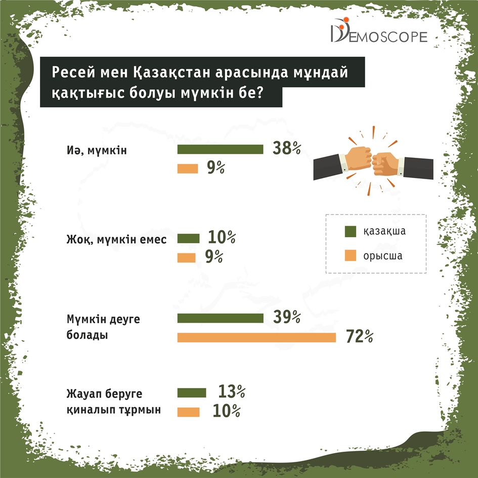 Ресей мен Қазақстан арасындағы осындай қақтығыс болу ықтималдығын бағалау да – маңызды көрсеткіш. Сауалнама қатысушыларының 65%-і мұндай қақтығыстың болмайтынына сенімді. Бұған сенімді оптимистердің көбі – әйелдер (58%) мен сұрақтарға орысша жауап берген респонденттер (72%). Бұл жауапты таңдағандардың арасында қазақ тілінде жауап берген азаматтар аздау (39%).
