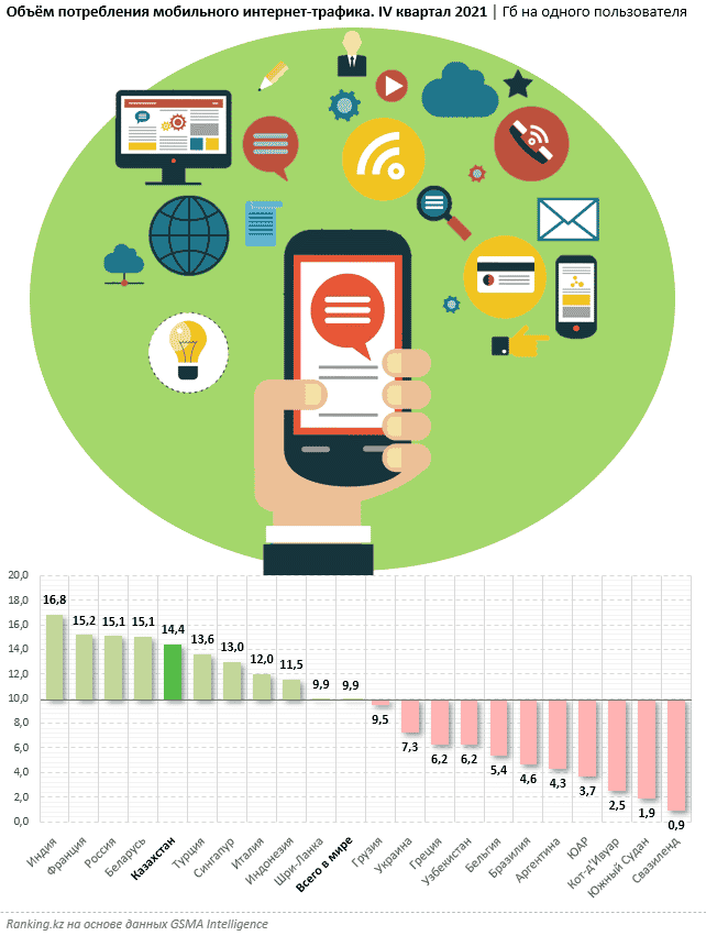 Примечательно, что показатели РК ощутимо выше, чем в среднем по миру. В разрезе стран Казахстан входит в ТОП-15 по наибольшему объёму потребления мобильного интернет-трафика. Так, по итогам четвёртого квартала 2021 года потребление мобильного интернет-трафика на одного пользователя в Казахстане составило 14,4 Гб, что на 46% больше среднего значения. Кроме того, это больше, чем, скажем, в Турции (13,6 Гб), Сингапуре (13 Гб), Италии (12 Гб), Греции (6,2 Гб), Бельгии (5,4 Гб) и многих других странах.