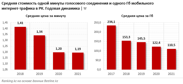 Вместе с тем снижается и стоимость минуты голосового соединения: так, в 2021 году показатель составлял в среднем 1,19 тг, в 2020-м — 1,2 тг, в 2019-м — 1,34 тг, в 2018-м — 1,41 тг.
